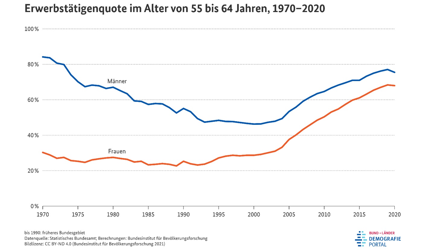 Die Lage von älteren Menschen auf dem Arbeitsmarkt hat sich in den vergangenen Jahren erheblich gewandelt. Die Erwerbsbeteiligung der 60 - 64 – jährigen nahm so stark zu wie in keiner anderen Altergruppe. Sie hat sich in den letzten 10 Jahren von 41% (2010) auf 61% (2020) gesteigert.