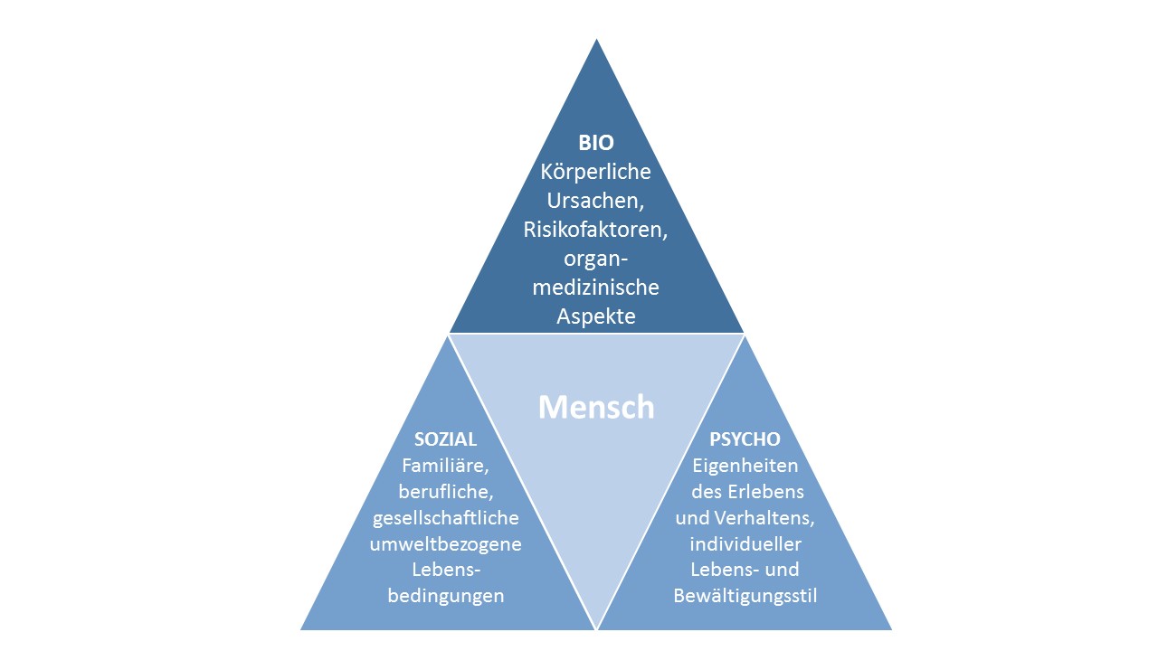 In der Medizin spricht man vom biopsychosozialen Modell. Zur biologischen Ebene gehört der Körper mit all seinen Organen und Zellen. Biologische Einflüsse sind demnach zum Beispiel Krankheitserreger, die eine Infektion verursachen oder ein Unfall, der eine Verletzung hervorruft. Weitere Einflüsse auf die Gesundheit kommen aus den Bereichen PSYCHO und SOZIAL (vgl. Schema). Eine Überlappung der verschiedenen Bereiche kann zur Chronifizierung der Probleme führen. TEAM erstellt individuelle und ganz persönliche „Gesundheitspakete“ für Sie zusammen. Es können verschiedene Experten zum Einsatz kommen. Im Zusammenspiel ist das der beste und effektivste Weg zu mehr Gesundheit. Wir nehmen uns auch der Pflegeproblematik ihrer Angehörigen an.
